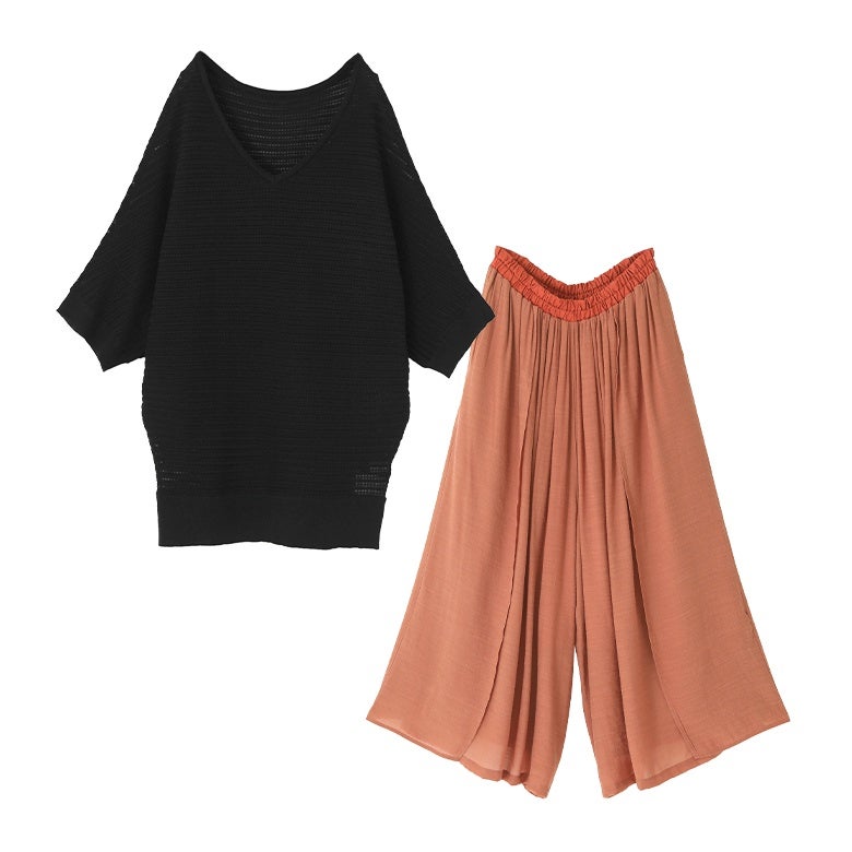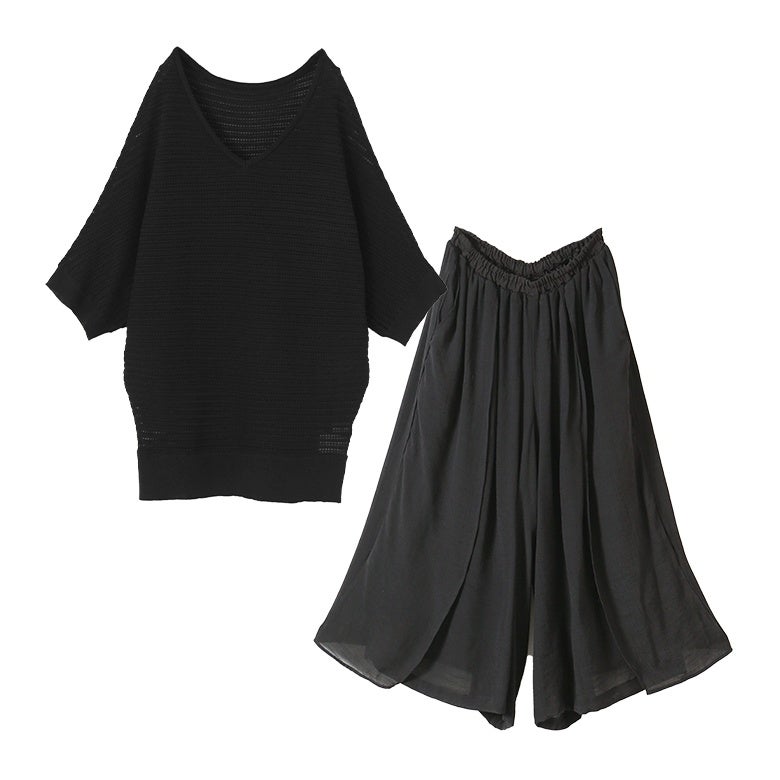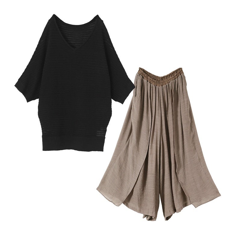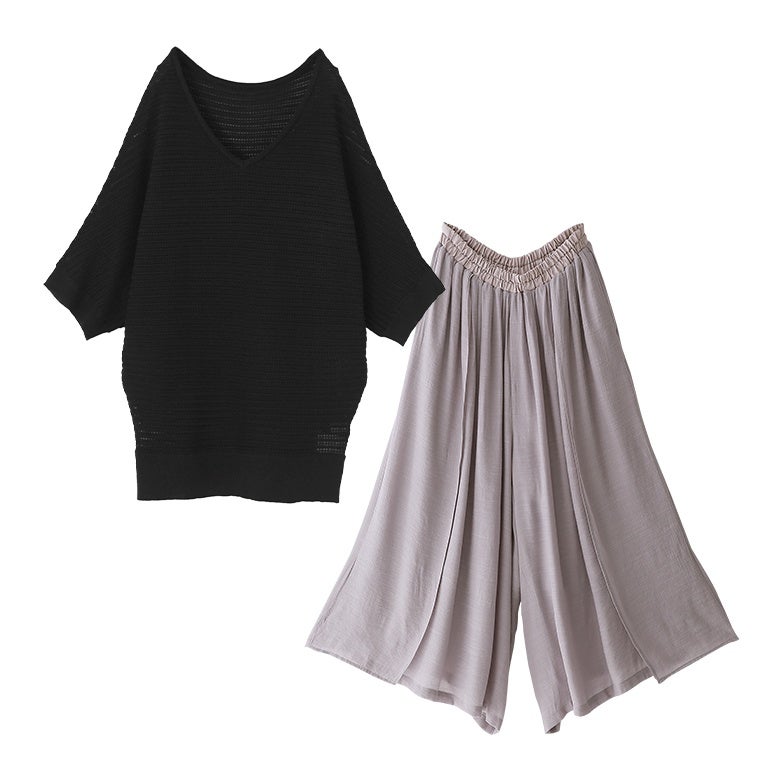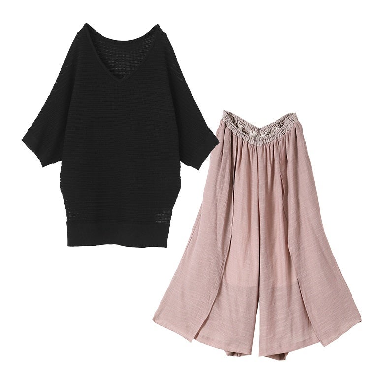 他の画像を見る 届いてすぐにお洒落に変身2点コーデSET♪ 『透かし編みドルマンサマーニット×ゆるひら涼スラブパンツコーデ2点SET』【メール便不可】【20】 販売開始前です。 販売期間 2026/04/14 10:00 〜 2027/04/10 23:59 ¥ 8,460 税込 (0)