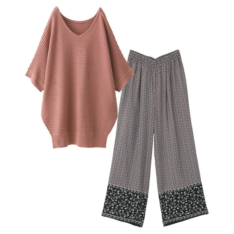 他の画像を見る 届いてすぐにお洒落に変身2点コーデSET♪ 『透かし編みドルマンサマーニット×パネル柄ギャザーイージーパンツコーデ2点SET』【メール便不可】【15】 販売開始前です。 販売期間 2026/04/15 10:00 〜 2027/04/13 23:59 ¥ 8,940 税込 (0)