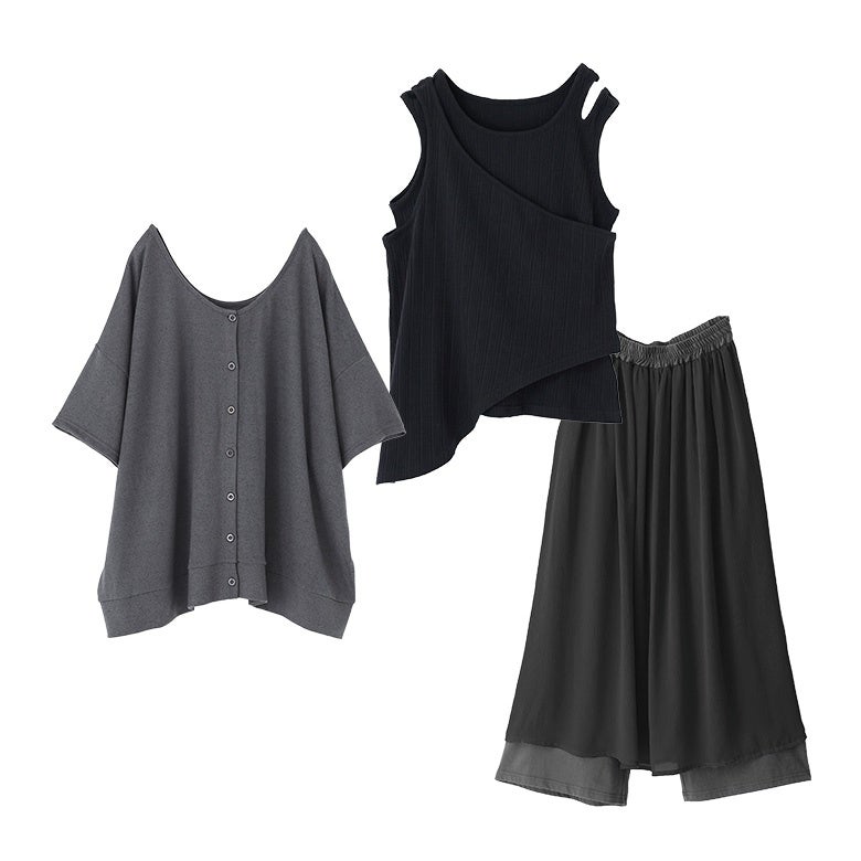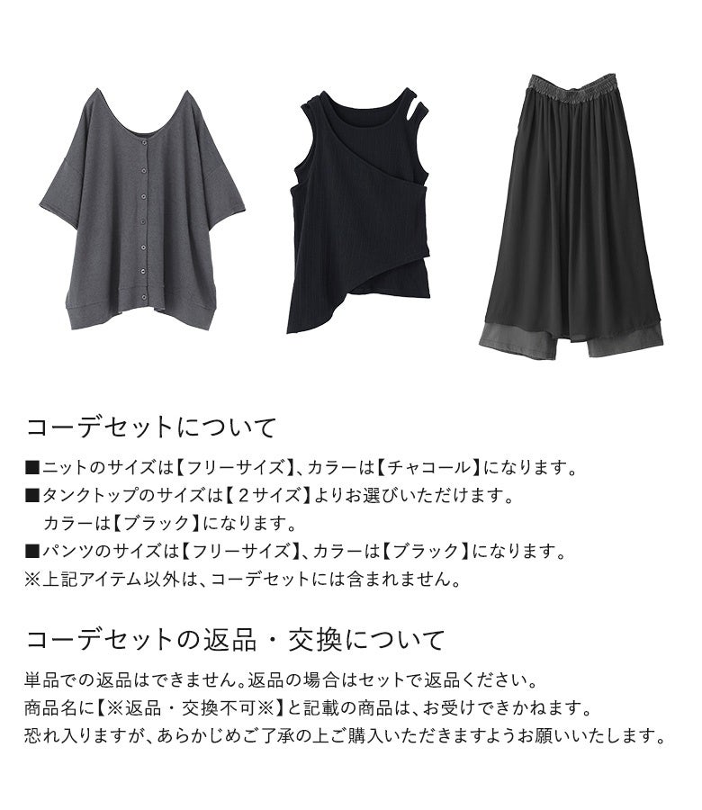 他の画像を見る 届いてすぐにお洒落に変身3点コーデSET♪ 『2wayリバーシブルニット×変形2枚重ねリブタンクトップ×レイヤードフレアワイドパンツコーデ3点SET』【メール便不可】【30】 販売開始前です。 販売期間 2026/04/15 10:00 〜 2027/04/13 23:59 ¥ 11,530 税込 (0)