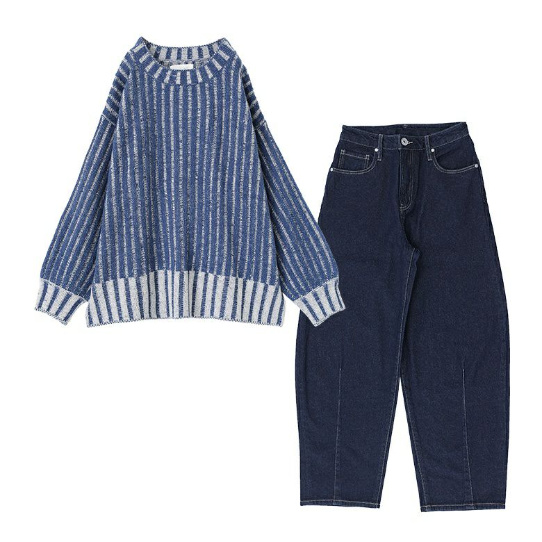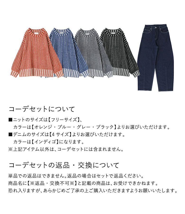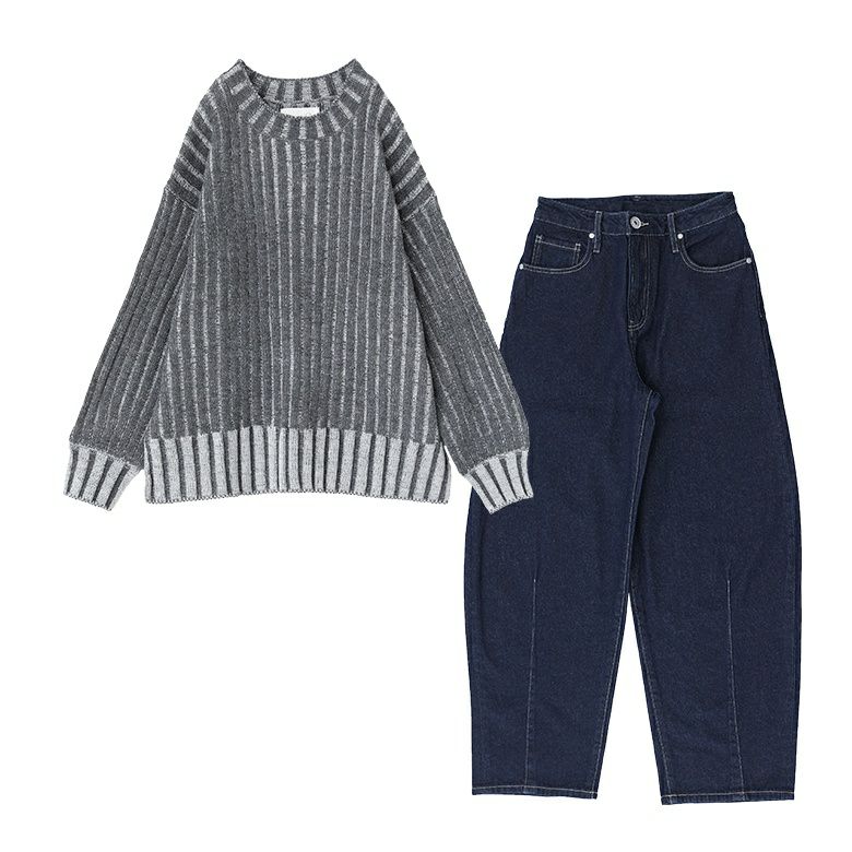 他の画像を見る 送料無料★届いてすぐにお洒落に変身2点コーデSET♪ 【送料無料】『二重臼配色リブ編みニット×カーブシルエットデニムコーデ2点SET』【メール便不可】【50】 ¥ 9,940 税込 (0)