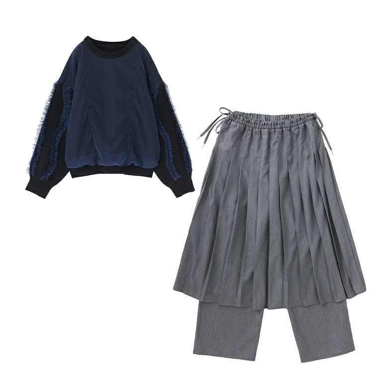 他の画像を見る 送料無料★届いてすぐにお洒落に変身2点コーデSET♪ 【送料無料】『チュールレイヤーニット×プリーツスカート×ストレートパンツセットコーデ2点SET』【メール便不可】【50】 ¥ 16,960 税込 (0)