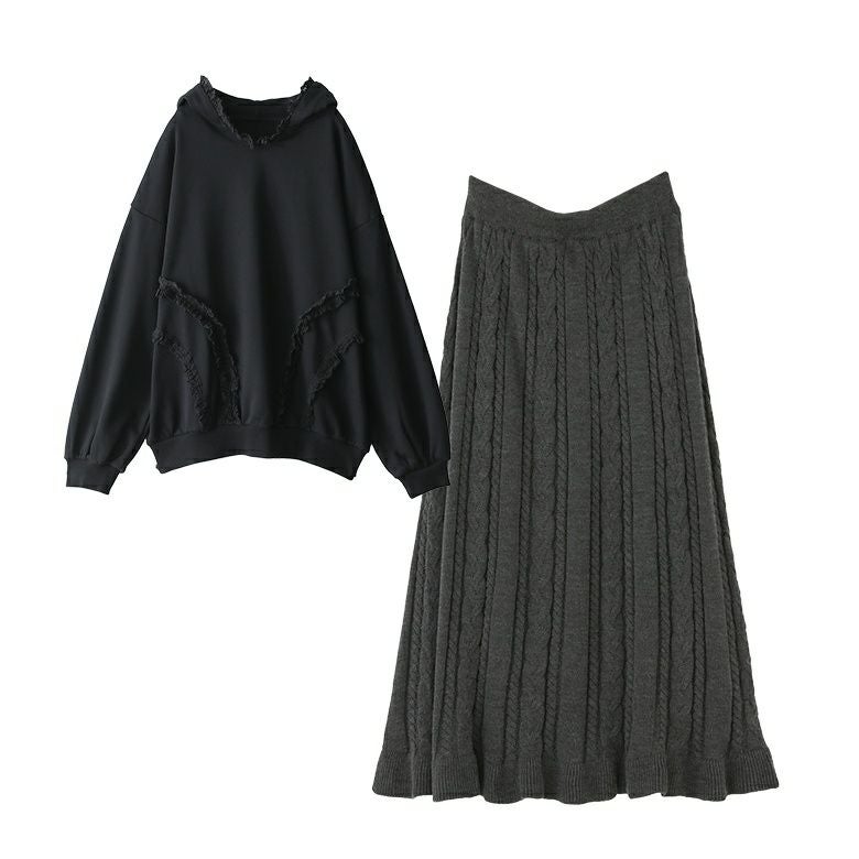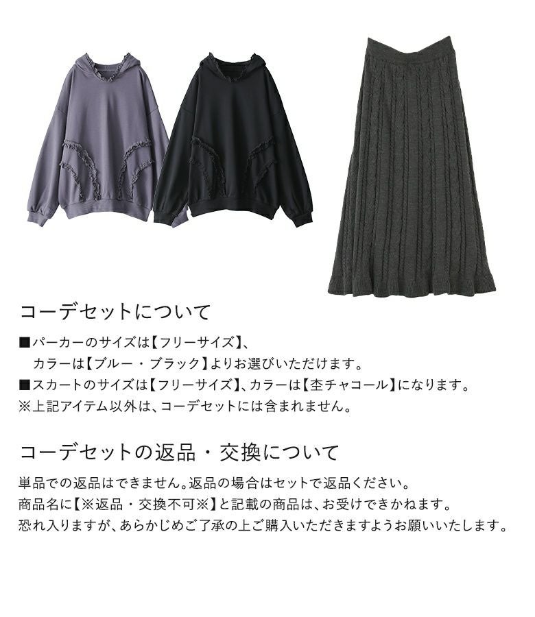 他の画像を見る 送料無料★届いてすぐにお洒落に変身2点コーデSET♪ 【送料無料】『ケーブルニットフレアスカート×テープレーススウェットパーカーコーデ2点SET』【メール便不可】【50】 ¥ 12,960 税込 (0)