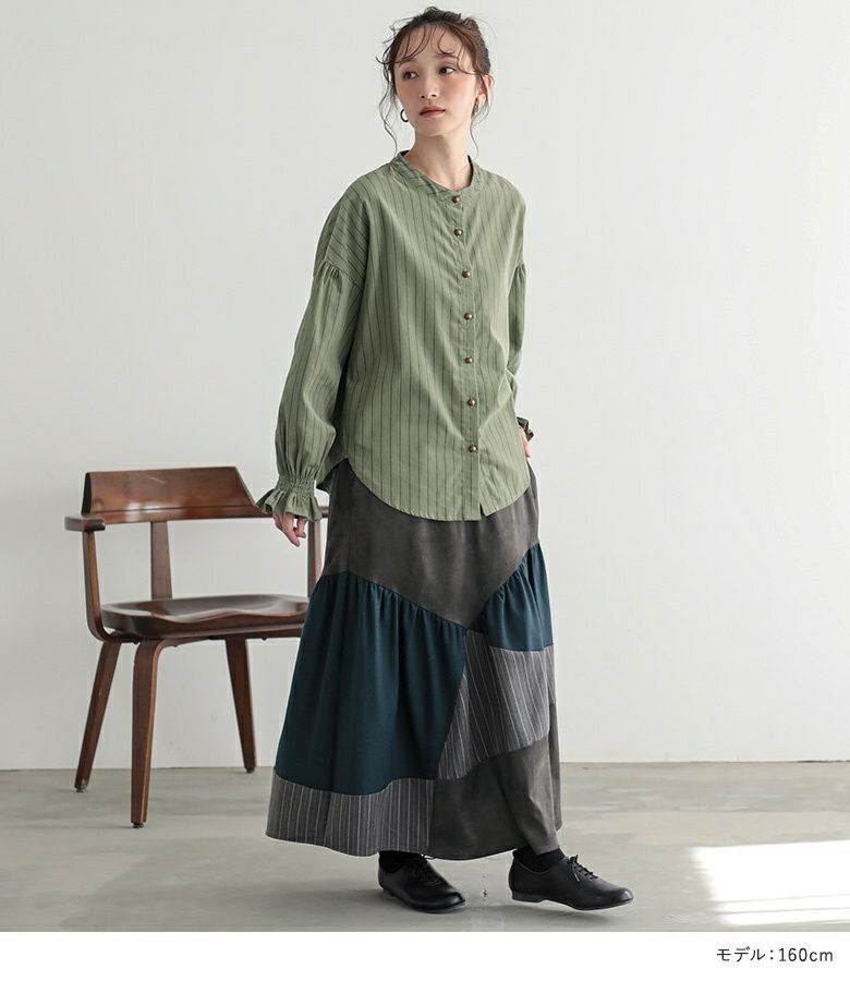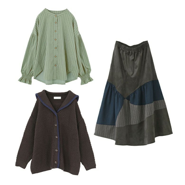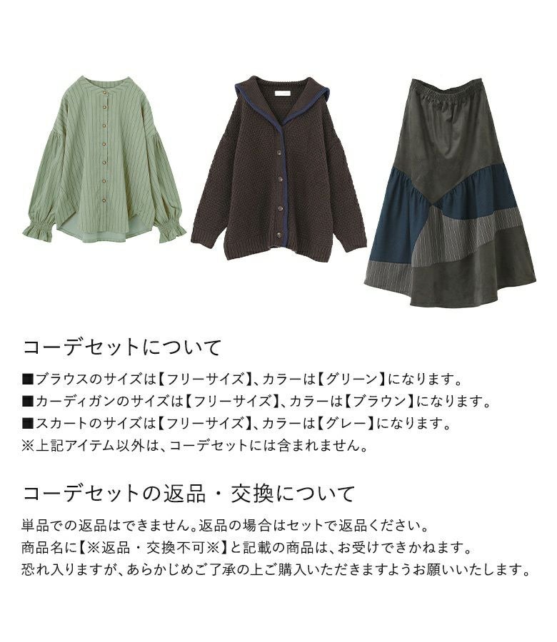 他の画像を見る 送料無料★届いてすぐにお洒落に変身3点コーデSET♪ 【送料無料】『ストライプコーデュロイブラウス×鹿の子編みセーラーカラーカーディガン×カーブ切替スカートコーデ3点SET』【メール便不可】【80】 ¥ 16,940 税込 (0)