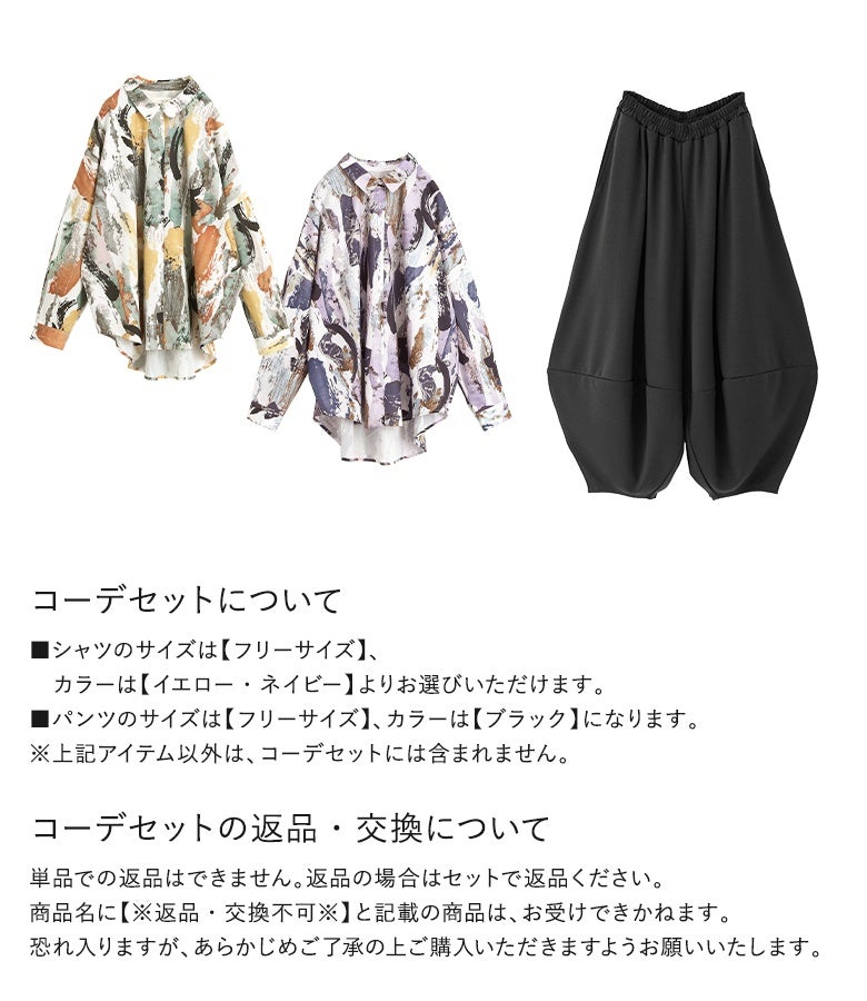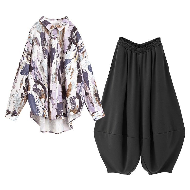 他の画像を見る 届いてすぐにお洒落に変身2点コーデSET♪ 『水彩プリントシャツ×ポンチコクーンパンツコーデ2点SET』【メール便不可】【30】 販売開始前です。 販売期間 2026/03/05 10:00 〜 2027/03/02 23:59 ¥ 8,550 税込 (0)