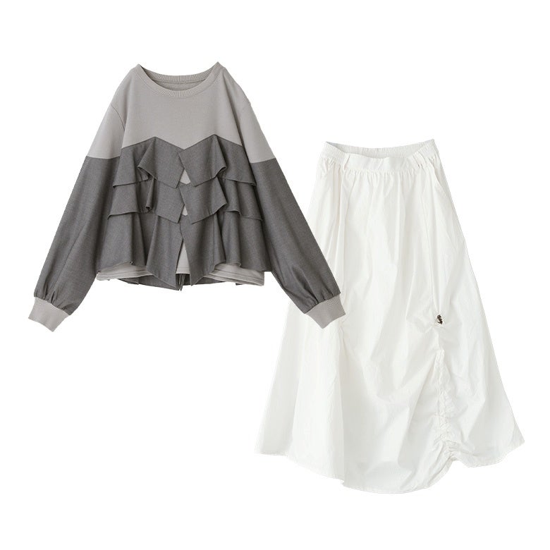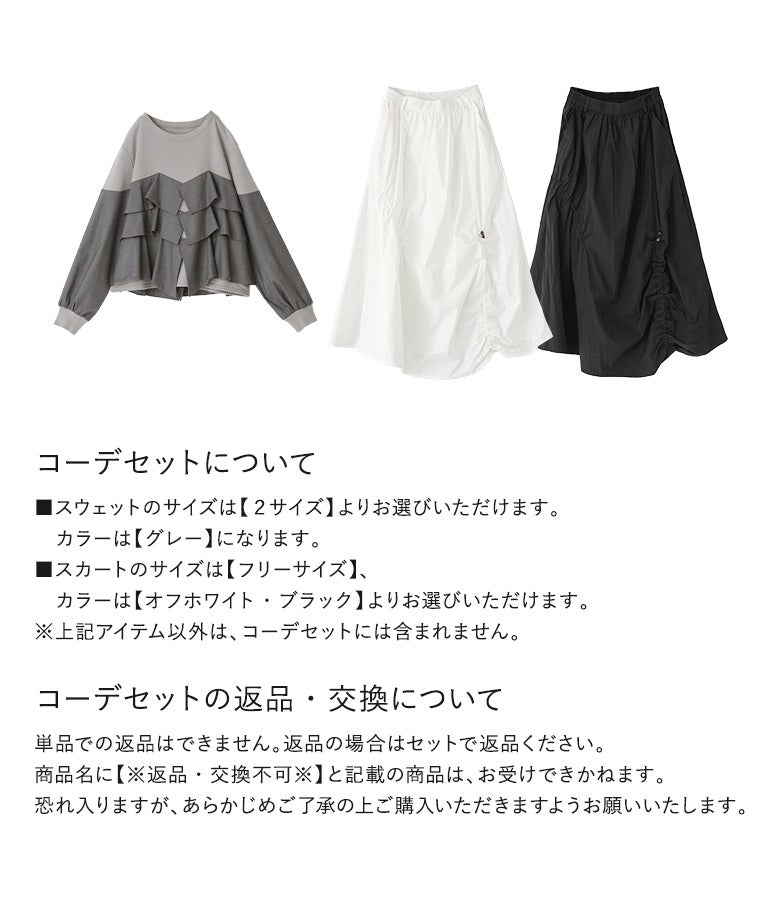 他の画像を見る 届いてすぐにお洒落に変身2点コーデSET♪ 『異素材フリルドッキングスウェット×変形シャーリングデザインスカートコーデ2点SET』【メール便不可】【40】 販売開始前です。 販売期間 2026/03/06 10:00 〜 2027/03/03 23:59 ¥ 14,960 税込 (0)