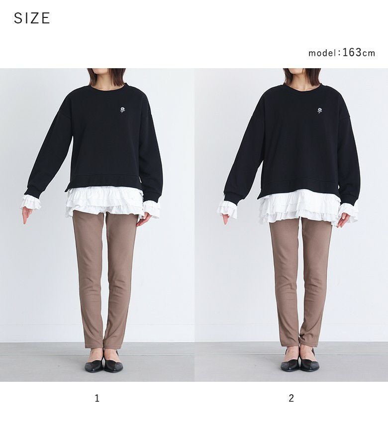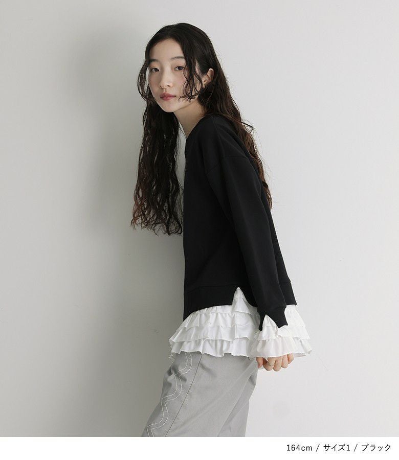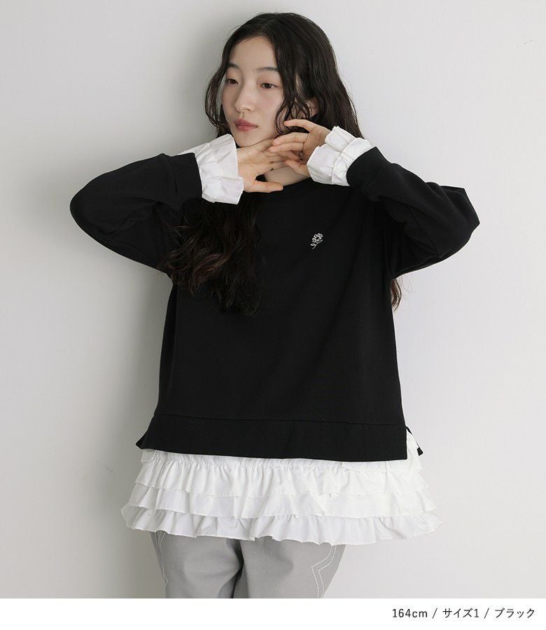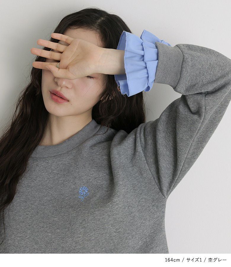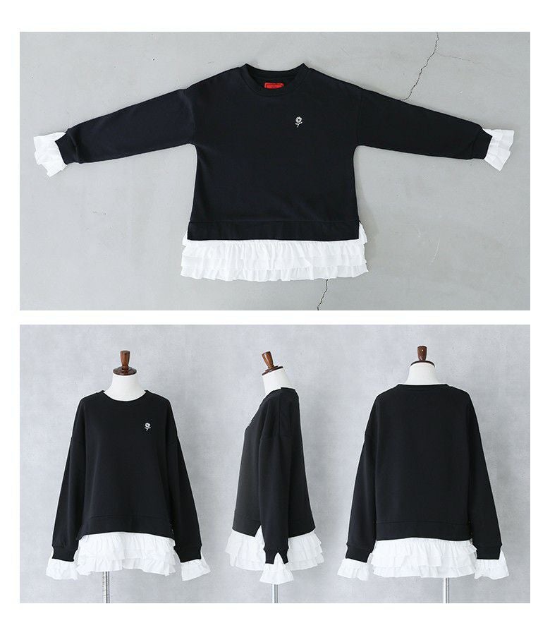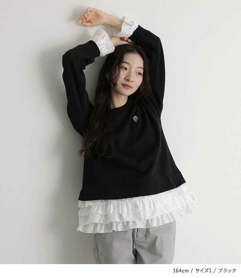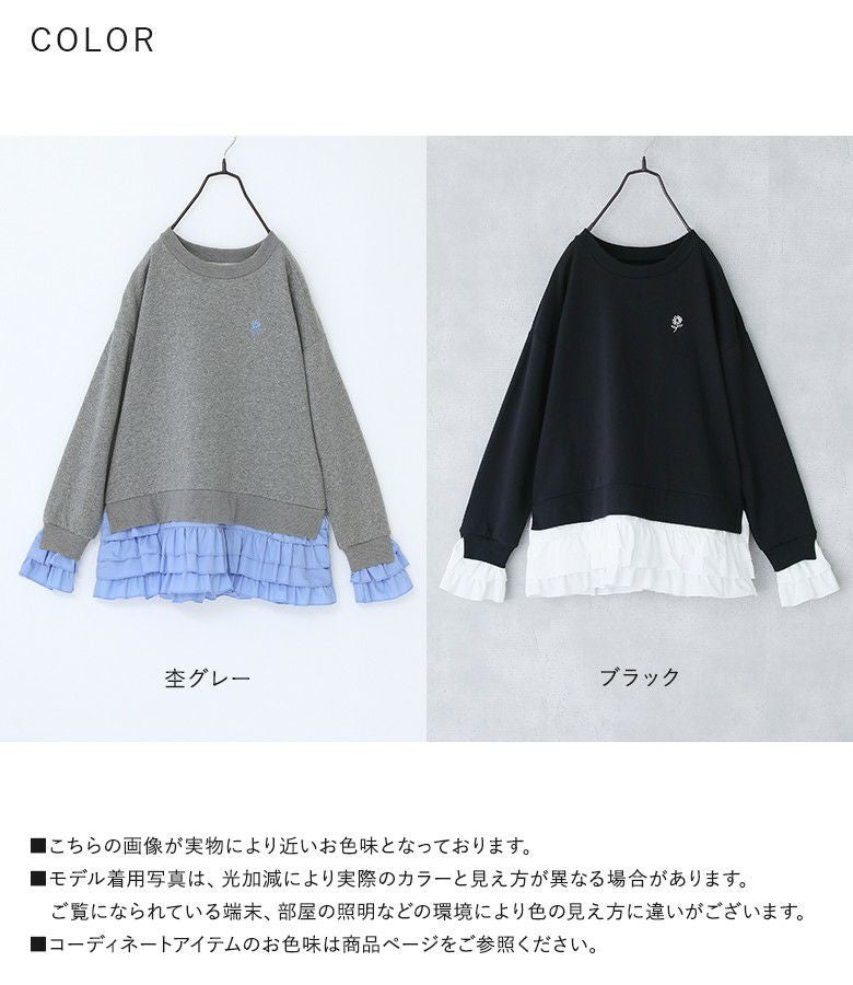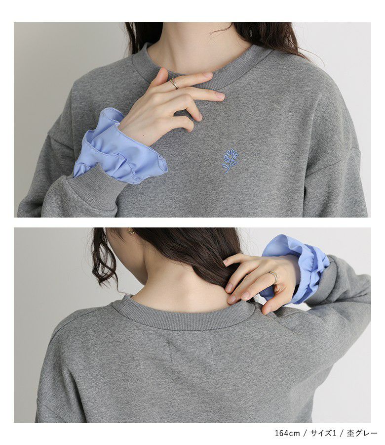 他の画像を見る 選べる2サイズ展開!袖口と裾に布帛生地のフリルをドッキングさせたスウェット。 『somari imaginationフリルデザイン裏起毛スウェット』【メール便不可】【30】 ¥ 6,980 税込 5.00 (4)