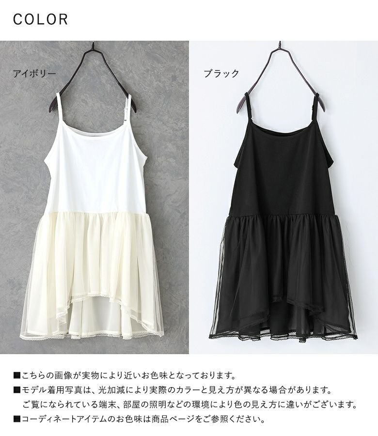 他の画像を見る 選べる2サイズ展開!軽やかなシフォンに少しハリ感のあるチュールを重ねたレイヤードキャミソール。 『somari imaginationチュールレイヤードキャミソール』※メール便可※【10】 ¥ 3,960 税込 (0)