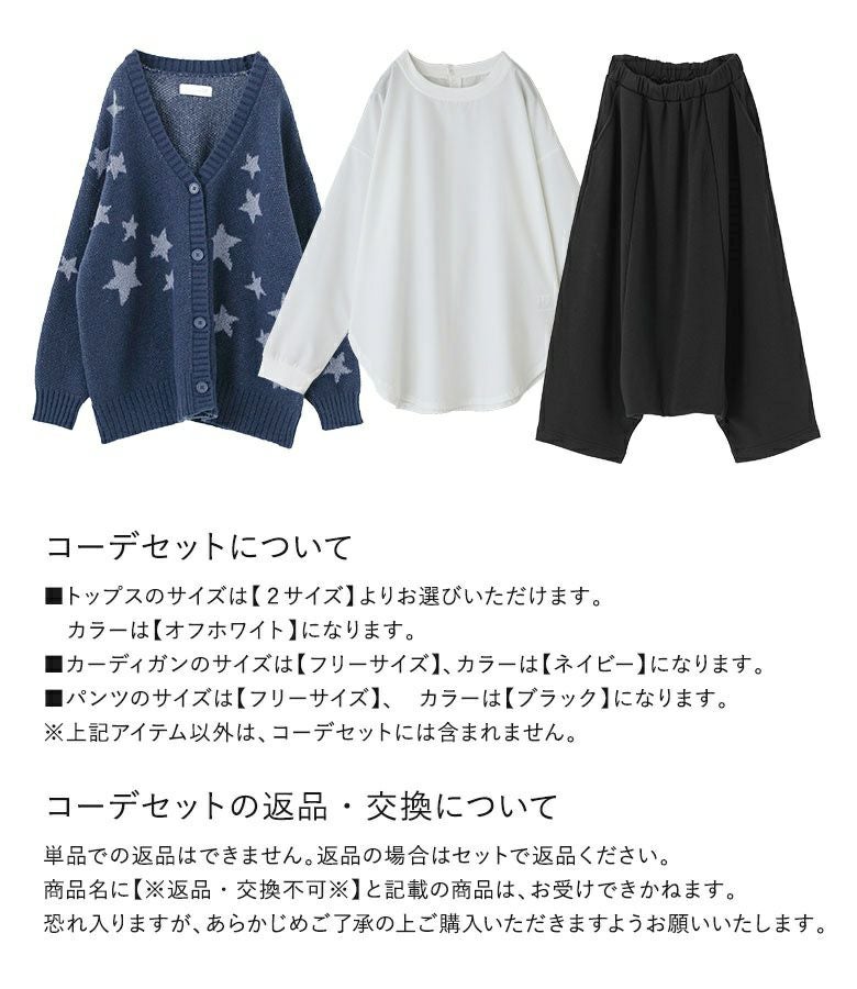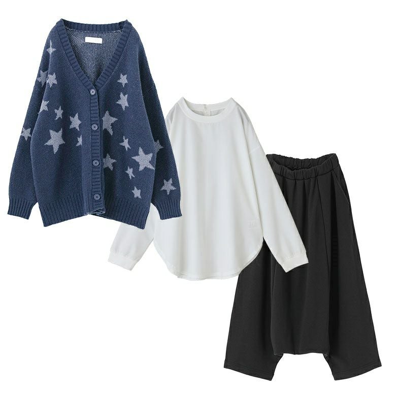 他の画像を見る 送料無料★届いてすぐにお洒落に変身3点コーデSET♪ 【送料無料】『星柄ニットカーディガン×シャツ生地クルーネックプルオーバー×裏シャギーサルエルパンツコーデ3点SET』【メール便不可】【65】 ¥ 12,900 税込 (0)