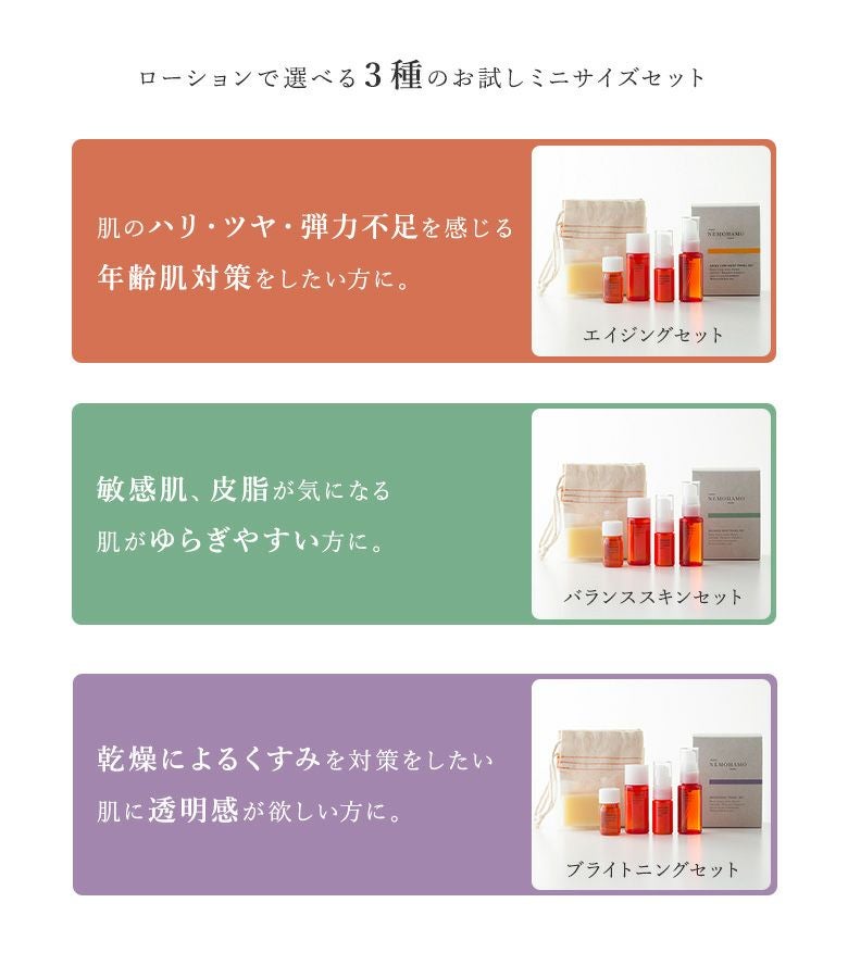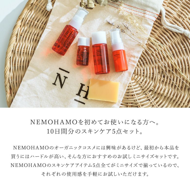 他の画像を見る 10日間分のスキンケアミニサイズ5点が入った、選べる3タイプ。NEMOHAMOトライアルセット。 『NEMOHAMOお試しミニサイズ5点セット』◇【メール便不可】【20】 ¥ 4,950 税込 (0)