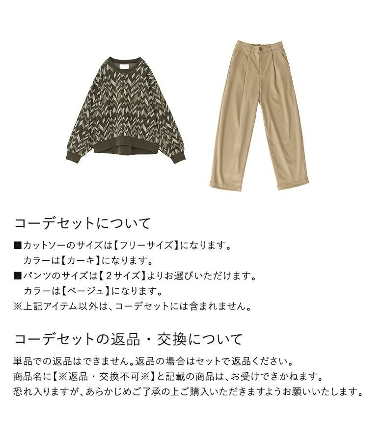 他の画像を見る 送料無料★届いてすぐにお洒落に変身2点コーデSET♪ 【送料無料】『幾何学柄ジャカードカットソー×微起毛ワンタックテーパードパンツコーデ2点SET』【メール便不可】【30】 ¥ 8,940 税込 (0)