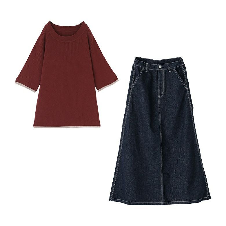 他の画像を見る コーデセット届いてすぐにお洒落に変身2点コーデSET♪ 『配色ライン5分袖リブニット×ペインターデザインデニムロングスカートコーデ2点SET』【メール便不可】【30】 ¥ 7,970 税込 (0)