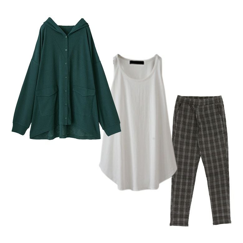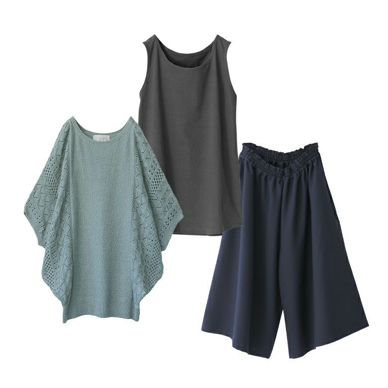 他の画像を見る 送料無料★届いてすぐにお洒落に変身3点コーデSET♪ 【送料無料】『大人めガウチョパンツ×シンプルコットンタンクトップ×透かし編み切替ドルマンニットコーデ3点SET』【メール便不可】【25】 ¥ 10,510 税込 (0)