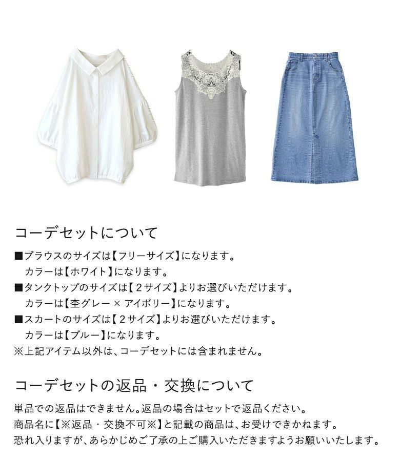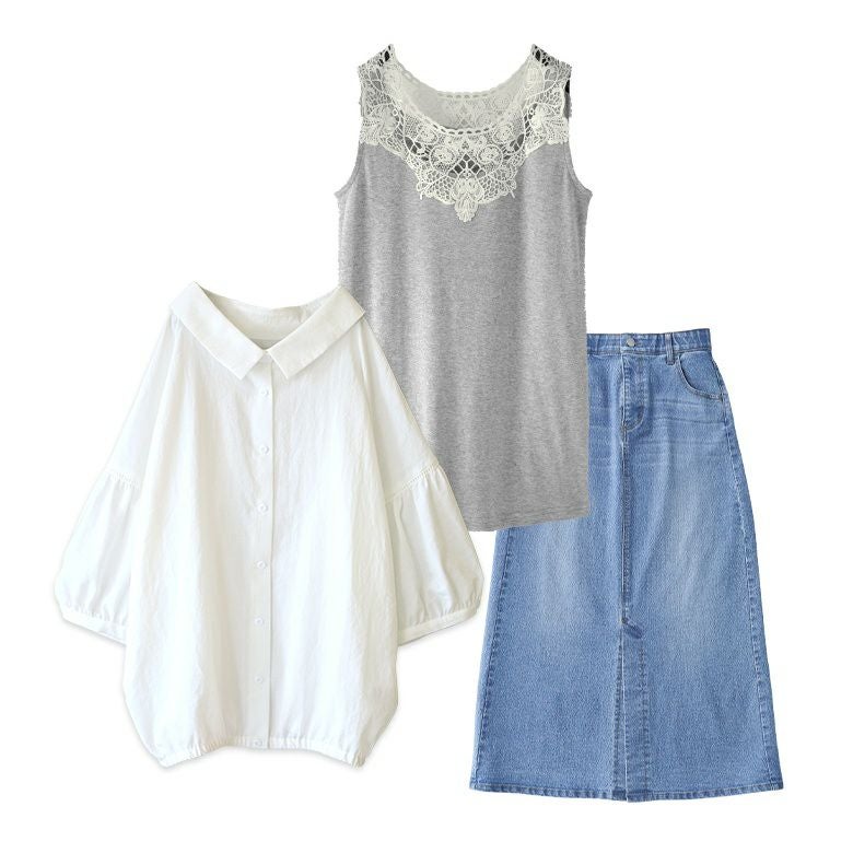 他の画像を見る 送料無料★届いてすぐにお洒落に変身3点コーデSET♪ 【送料無料】『ふんわりパフスリーブブラウス×襟元レースデザインタンク×ストレッチデニムナロースカートコーデ3点SET』【メール便不可】【35】 ¥ 12,070 税込 (0)