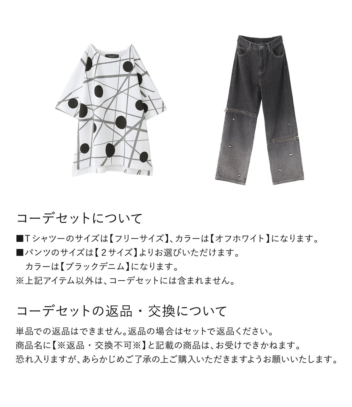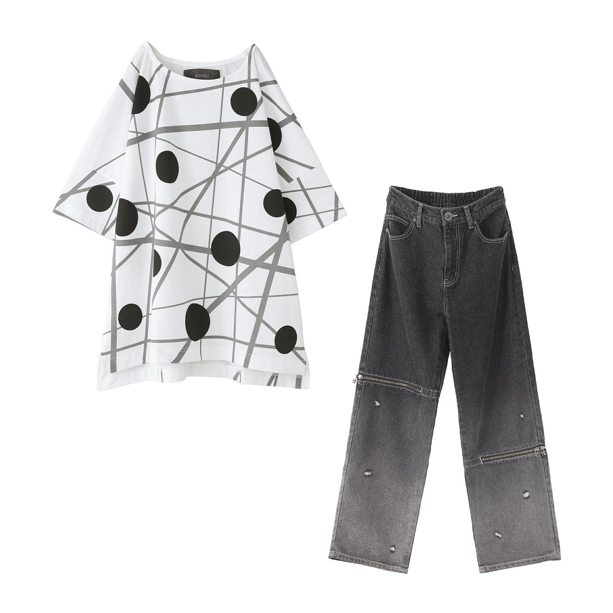 他の画像を見る 送料無料★届いてすぐにお洒落に変身2点コーデSET♪ 【送料無料】『ランダムドット柄モードTシャツ×ジップデザイングラデーションデニムパンツコーデ2点SET』【メール便不可】【30】 ¥ 11,880 税込 (0)